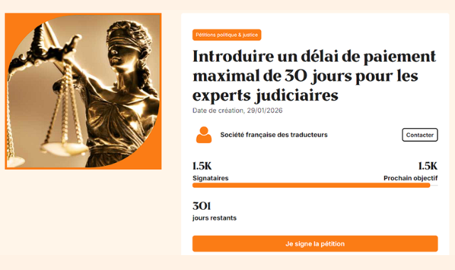 Depuis plusieurs années, les experts judiciaires, y compris nos collègues traducteurs et interprètes experts qui œuvrent pour la Justice, font face à des délais de paiement pouvant aller de quelques semaines à plus d’un an. Le Sénat a récemment voté une proposition pour que le délai soit fixé à un maximum de 180 jours (six mois). Le risque, si l’Assemblée nationale venait à voter également pour cette loi, est que soit gravé dans la loi le fait que nos collègues doivent attendre six mois pour se faire payer. La SFT se mobilise en demandant aux députés de ramener ce délai à 30 jours.